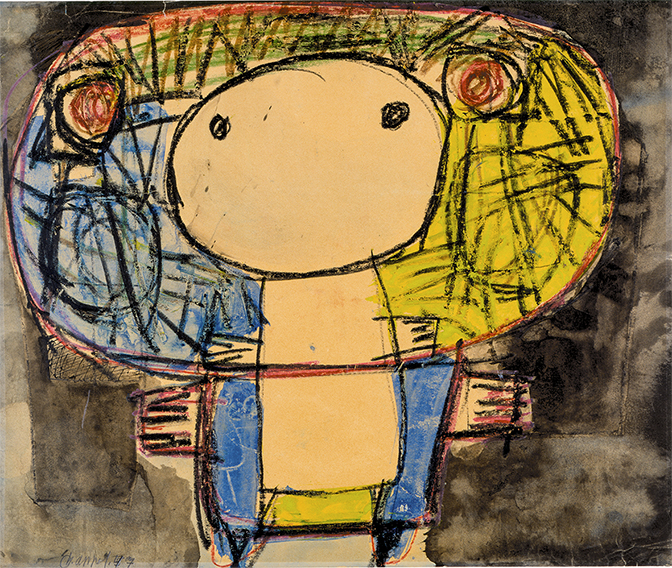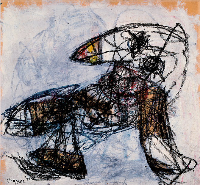 Udstillingen er en ualmindeligt spændende rejse gennem Karel Appels (1921 – 2006) særdeles varierede kunstneriske liv. Man stifter bekendtskab med nogle af Appels tidlige kreationer fra slutningen af 1940’ene som f.eks. ”Barn med blomster”, akvarel, kridt og tusch på papir og ”Dyr med fuglenæb”, kridt og gouache på papir. Begge karakteristiske i materialer og tegne- malemåde for hans tidlige værker. I den første sal, man går igennem i museets underetage, Prismesalen, finder man et bredt udvalg af Appels værker. Nogle lidt mindre, glasindrammede værker som f.eks. værket ”Tyr”, olie på lærred fra 1949 og værket ”Fisk og fugl”, gouache på papir fra 1946, men også flere noget større værker malet i olie på lærred og en del plakater fra hans udstillinger sammen med Corneille og Constant efter dannelsen af Cobra.
