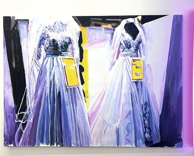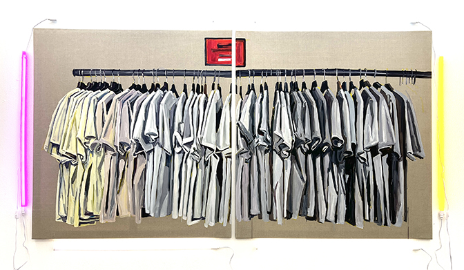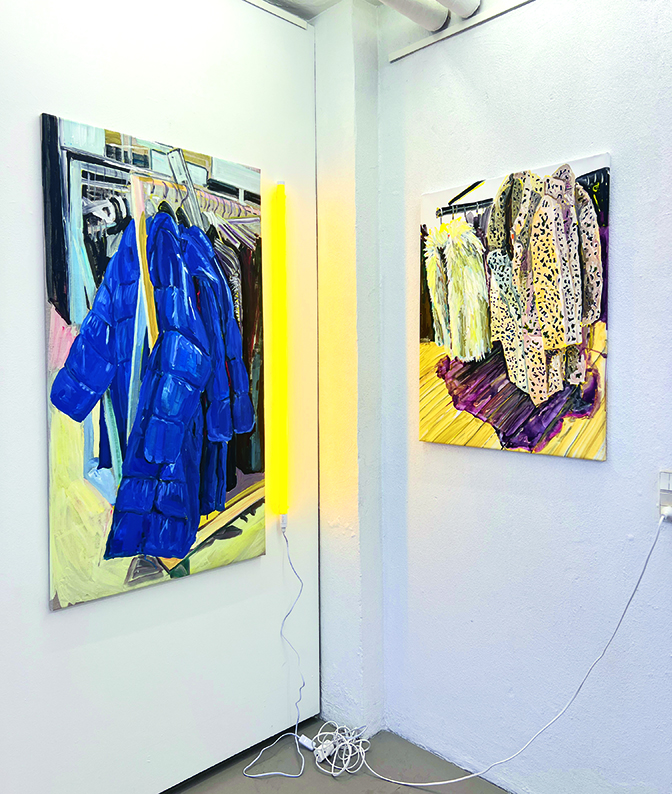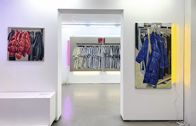 Henne om hjørnet, nede i kælderen hos galleriet Kbh Kunst kan du opleve den topaktuelle udstilling UDSALG med malerier af Linda Falkesgaard. Denne gang er det menneskets identitetsmarkører, modetøj og sko, der er trukket op i neonlys og muzak af Linda Falkesgaard. Tidligere har vi blandt andet kunnet opleve kunstnerens folieindpakkede blomsterbuketter og illuminerede kølediske med alskens lækkerier bag plast.