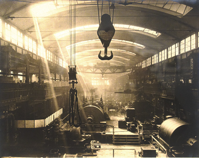 To billeder, taget af den tyske fotograf Hans R. Robertson (1883-1950) fra AEG Turbinefabrikker i 1933 viser storindustriens haller som katedraler, der hylder den moderne teknologi.