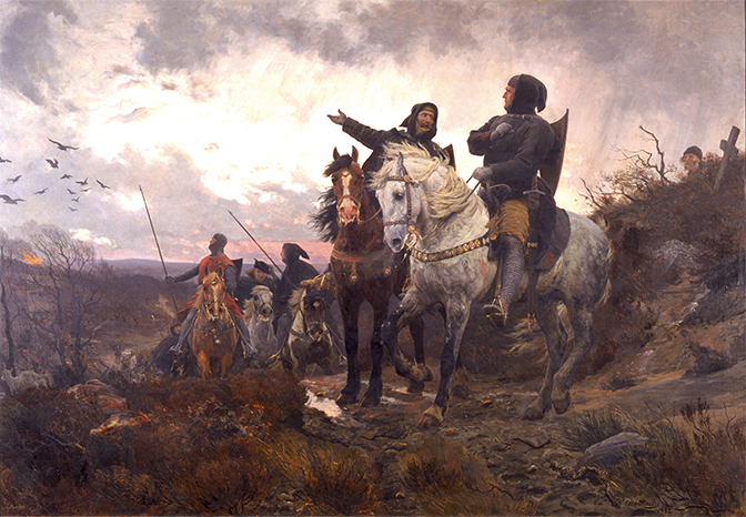 Vi ser det berømte maleri af Otto Bache fra 1882 af ”De sammensvorne rider fra Finderup Lade efter mordet på Erik Klipping”, der foregik i ly af mørket Sankt Cæcilie nat i november 1286. De har netop stukket kong Erik Klipping ihjel i landsbyen Finderup ved Viborg og dermed begået det sidste kongemord i danmarkshistorien. De forblæste grå skyer på himlen truer. Mordet er aldrig blevet opklaret.