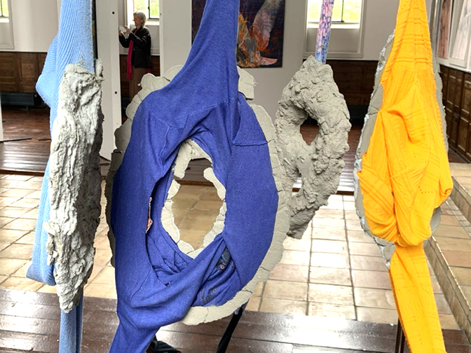 På udstillingen, der kun har åbent ganske kort tid, medvirker: fra venstre Karen Villia Jensen, Grete Kyed Hvam, Vibeke Jensen, Heidi Dacke, forrest Katka Arentsen, Inger Odgaard, Nina Kathrin Schlemm, Alina Shevchenko, samt Eva Hvelplund. Sidstnævnte var fraværende ved fotograferingen på åbningsdagen, men spiller ganske flot med i den samlede udstilling i det hvidkalkede rum, karakteriseret af det unikke lys fra kapellets høje, buede vinduer.