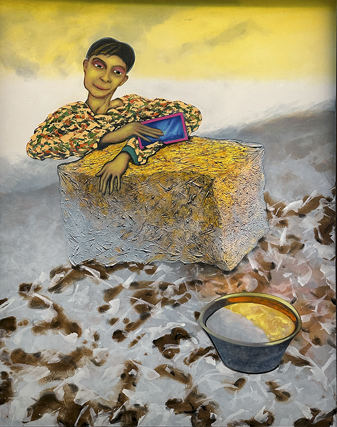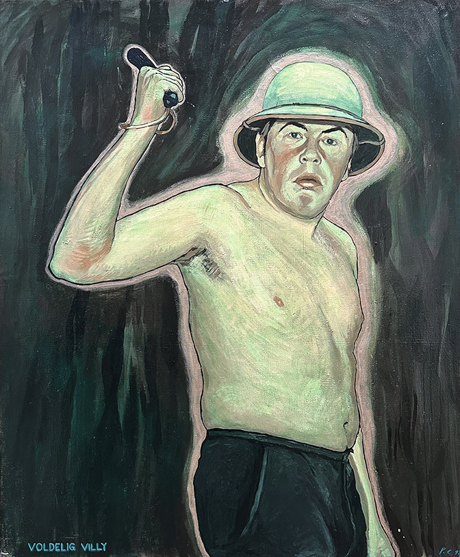 Magnus Andersen byder ind med et underfundigt, tvetydigt maleri med titlen En gårdbestyrer byder velkommen. Der er nu ikke meget landmand over den afbildede person, men derimod en absurditet, en humor parret med en stærk koloristisk, æstetisk sans. Ursula Reuter supplerer samlingen med et ældre portræt fra 1977 med titlen Vrede, og Peter Carlsen med bar mave og kølle i hånden med titlen Violent Villy.
