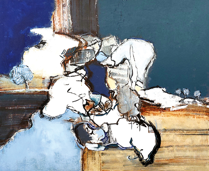 Blue light outside II er fra 2024-25, 90 x 110 cm, akryl og rugoso på lærred. Øjet rammes af fire hvide felter med løse omrids. De kan ses levende som væsener og samtidig ret uprøvede med det hvide fyldstof og deres udflydende konturer. De er sat op mellem forskellige blå flader og tre okkerbrune former, skydende ind fra hver side og fra oven. Det er som arkitektur, et stykke profilkarm, en stolpe og et plankeværk. De hvide formvæsener virker bløde, sårbare, organiske mod dette faste stof. Men de må drive sig selv til at være aktive. Den ene hænger der mellem karm og plankeværk, mens bjælken fra oven rammer ned mod den. Den har kastet sig ud for at forbinde, bygge bro. Den er nærmest ved at falde ned i det lyseblå rum. Formvæsenerne fører ligesom en samtale med deres forskellige temperamenter: den oprejste vakte til højre, den vegetative liggende forneden, den lyttende til venstre og den dristigt hængende. Et dybblå kompakt felt i midten sætter et sugende punktum for samtalen der er svær og nødvendig. Motivet udspiller sig med træer på hver side, små træer med stribekroner, et til venstre på profilkarmens overkant og tre mindre til højre på en flad bakkeskråning. De noterer det fortællende forløb. Så man med dem går fra ro gennem formvæsenernes drama til ro igen.