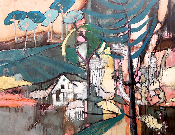 To whom it may concern er fra 2025, 100 x 130 cm, akryl på lærred. Det er tilsyneladende en scene ude på landet ved en gård, hvor øjet kan strække sig bagud henover marker mod en trærække i det fjerne. I forgrunden rager et træ op med dybgrønne vajende grene. Under det er der ’panik’, et rod af former. En gren stikker ud af dette kaos, bøjer opad med et enkelt blad. Et andet træ står midt i billedet henne ved gården, et mærkeligt træ. Der er et unaturligt hul i dets ellers kompakte mørkegrønne krone. Det åbner for et melet hvidgrønt og et rosa felt. Den splittede krone har en gul kontur, pegende ned mod gården. Bygningerne ser ramponerede ud med skæve vindueshuller, slidte mure. Fra venstre glider tungede former ind mod huset, gule, rødlige, grågrønne, helstøbte ’jord’-felter i modsætning til affaldsdyngen til højre. En grøn vej skrår sig fra nederste billedkant op mod huset mellem de to træer, mellem det genstridige træ med det irriterende hul med stritter i og så det andet træ med dets umiddelbart mærkbare vajende liv, mellem det svært gennemskuelige og det selvfølgelige udsagn.