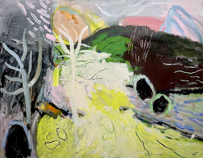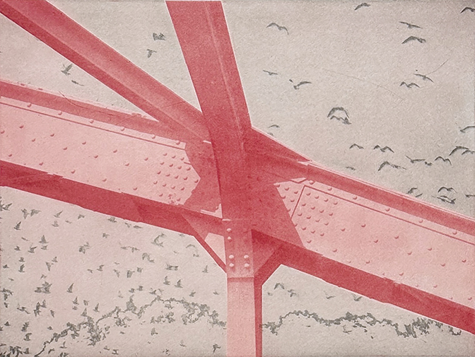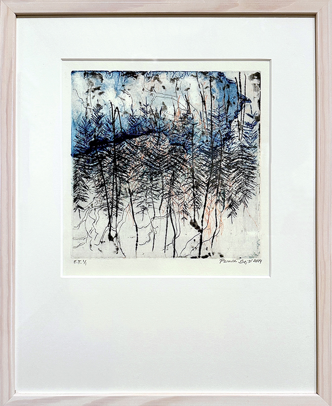 På en iøjnefaldende plads på salens endevæg fanger Hanne Ida Helstrups grafiske udtryk opmærksomheden. Det store værk kunne ligne et fotografi af nøgne træer i et skovdyb, hvor lyset spiller mellem træerne. Motivet gentager sig, og der er en stramhed i kompositionen. Bevæger man sig til siden forandrer lyset sig i takt hermed. Materialet er dog meget mere originalt: ætsede alu-plader tilført tagpap i form af de sorte, langstrakte træstammer – fascinerende tilgang til materialet. Grafikken er i det hele taget stærkt repræsenteres hos kunstnergruppen. Pernille Bejer medbringer 7 unika raderinger. Det er små kvadratiske studier, der viser vej ind i grafikkens mangfoldige udtryk gennem ætsning, koldnål og flerfarvetryk. Det kunne ligne naturstudier, og associationen er da også tydelig, men de er uden titel, så vi må bare opleve dem for det, de er: små æstetiske udsagn med noget ægte og værdifuldt gemt i hvert eneste billede. Annemette Heltoft mestrer den vanskelige fotogravure i tre små studier af bygningsdele. Det har givet nogle fine grafiske tryk med sarte rosa stålkonstruktioner – tilsyneladende brokonstruktioner – som viser vej til billedernes titler: ”Overgang”, ligesom de anslår hele udstillingens samlede tema: ”Landet imellem”.