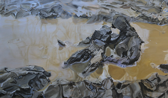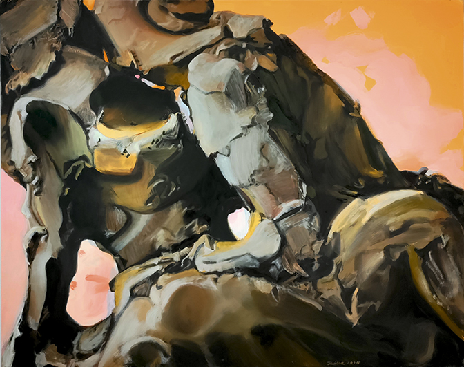 Et nyt, næsten monokromt hovedværk af billedkunstneren Külli Suitso viser en bevægende omfavnelse mellem to forbundne skikkelser midt i begyndelsens og slutningens flod. Af ler er de. Malet med inspiration i det stof, vi mennesker er gjort af.